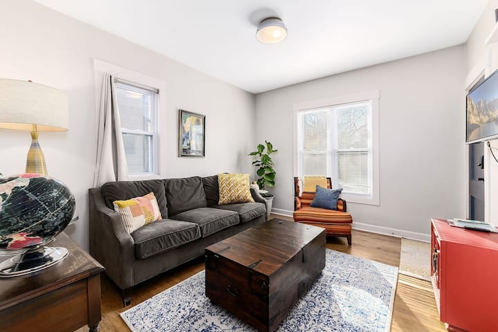 Stay includes: *Ground level apartment (1 step to climb)*King Bd *47' smart TV *Fast Wifi *Fully Stocked Kitchen + Microwave + Fridge + Coffe maker + Tea Note: Weekly and monthly discounts are available. Rent our bright and cozy loft located just a few blocks from Historic Downtown Oak Park.
